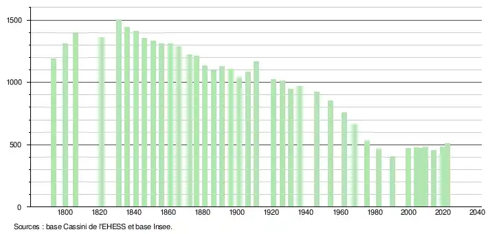 L'évolution du nombre d'habitants est connue à travers les recensements de la population effectués dans la commune depuis 1793. Pour les communes de moins de 10 000 habitants, une enquête de recensement portant sur toute la population est réalisée tous les cinq ans, les populations de référence des années intermédiaires étant quant à elles estimées par interpolation ou extrapolation[16]. Pour la commune, le premier recensement exhaustif entrant dans le cadre du nouveau dispositif a été réalisé en 2004[17].