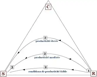 Ce triangle permet également de rendre compte des successions végétales[2],[3] au même titre que le modèle r/K de Robert MacArthur et Wilson. Les étapes de succession sont orientées globalement depuis le sommet R vers le sommet S, en passant par le milieu du triangle où l'importance du facteur C est maximisée. On peut donc distinguer trois phases, par exemple en conditions de forte productivité :
