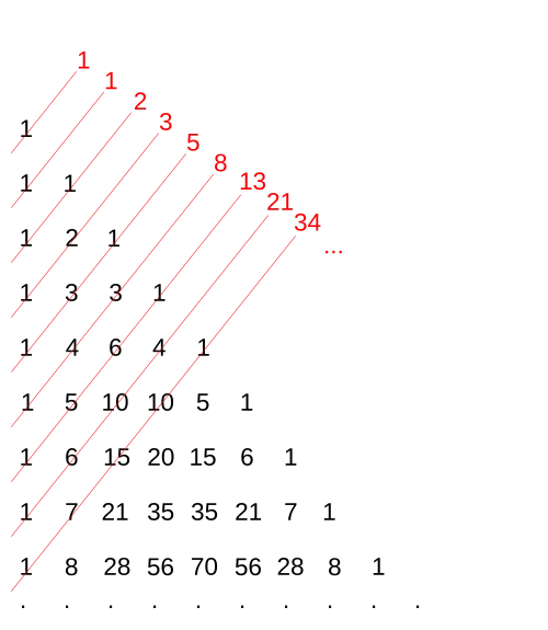 - Généralisation[9] : si les termes de la diagonale ascendante de rang n sont , on a