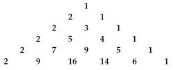 • Si on regarde une ligne comme la succession des chiffres décimaux d'un entier, cette ligne est "égale" à une puissance de 11 multipliée par 21 (, pour la ligne n). Ainsi, la ligne 4 : (2, 7, 9, 5, 1) devient , et la ligne 5 (2, 9, 16, 14, 6, 1) devient (après réarrangement) . Cette propriété s'explique en faisant x = 10 dans le développement de (2x + 1)(x + 1)n−1. Mais x peut aussi être une base quelconque. par exemple :