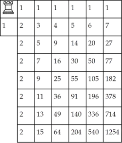 Chaque case indique le nombre de chemins distincts pour que la tour atteigne cette case, en supposant que seuls les mouvements vers la droite et vers le bas sont autorisés. On retrouve le triangle de Pascal (2,1) disposé différemment.