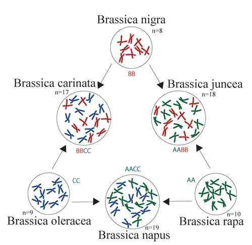 Ces trois espèces existent en tant qu'espèces distinctes, mais étant donné qu'elles sont étroitement apparentées, il était possible de les croiser. cependant, la consanguinité au sein des espèces ne produit pas de génomes stables. Cette reproduction interspécifique a permis la création de trois nouvelles espèces tétraploïdes de Brassica . Puisqu'elles sont dérivées des génomes de deux espèces différentes, ces plantes hybrides sont dites allotétraploïdes (elles contiennent quatre génomes, dérivés de deux espèces ancestrales différentes). Plus spécifiquement, il s’agit d’amphidiploïdes, c’est-à-dire contenant un génome diploïde de chacune des deux espèces différentes de "Brassica"). Les données provenant d'études moléculaires indiquent que les trois espèces diploïdes sont elles-mêmes paléopolyploïdes[6].