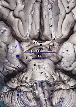 Vue antérieure du tronc cérébral humain, le trigone olfactif est légendé #4, en haut et à droite
