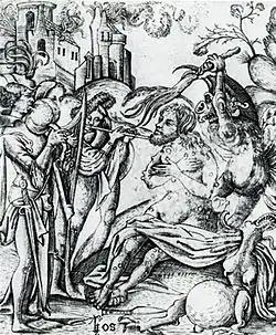 Cette iconographie est attestée à l'époque de Bosch et dans sa ville, Bois-le-Duc, où le « monogrammiste bos au couteau » (Michiel van Gemert ?), actif dans le premier quart du XVIe siècle, en a tiré le sujet d'une gravure[2].