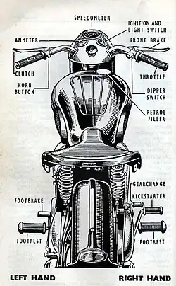 Tous les modèles sont équipés d'une boîte de vitesses à quatre rapports avec sélecteur au pied, d'une transmission primaire et secondaire par chaîne, d'un démarrage au kick, d'une fourche Girder à dureté réglable, d'une selle solo, de freins à tambour ainsi que d'un éclairage avant et d'un avertisseur électrique. L'instrumentation de série est sur le réservoir[n 35].