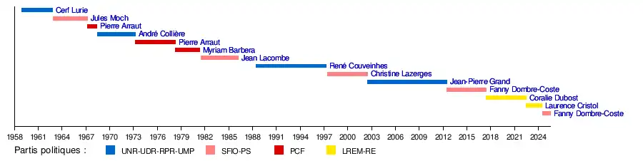 | IIIe | Pierre Arraut | PCF | Maire de Sète. Mandat écourté à la suite d'une dissolution parlementaire décidée par Charles de Gaulle. | ||