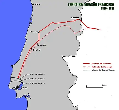 La troisième invasion du Portugal par les troupes françaises de Napoléon commence en juillet 1810 et se termine en avril 1811 avec le retrait des forces françaises vers Ciudad Rodrigo. Des trois tentatives d'invasion en territoire portugais, dont une première en 1807, commandée par Junot, et une seconde en 1809, commandée par Soult, c'est la plus importante en nombre d'hommes. Elle est commandée par le maréchal Masséna, l'un des maréchaux de France les plus réputés. Mais la qualité de l'armée anglo-portugaise commandée par Wellesley, duc de Wellington, ainsi que la stratégie utilisée et développée à partir des lignes de Torres Vedras vaudront un nouvel échec aux Français.
