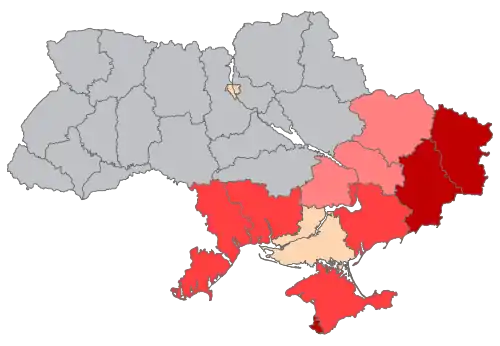 L'opposition à la sécession de l'Ukraine et à l'annexion par la Russie (le pourcentage combiné des personnes optant pour les options « Plutôt, non » et « Certainement, non, je ne sais pas ») obtient ces pourcentages dans divers oblasts ukrainiens du sud et de l'est[23]: