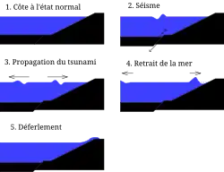 Un tsunami est créé lorsqu'une grande masse d'eau est déplacée. Cela peut être le cas lors d'un séisme important, d'une magnitude de 6,3 (valeur « seuil » d'après les catalogues de tsunamis disponibles : NOA, catalogue de Novossibirsk, etc.) ou plus, lorsque le niveau du plancher océanique le long d'une faille s'abaisse ou s'élève brutalement (voir Fig. 1), lors d'un glissement de terrain côtier ou sous-marin, lors d'un impact par un astéroïde ou une comète ou encore lors d'un retournement d'iceberg. Un fort séisme ne produit pas nécessairement un tsunami : tout dépend de la manière (vitesse, surface, etc.) avec laquelle la topographie sous-marine (bathymétrie) évolue aux alentours de la faille et transmet la déformation à la colonne d'eau au-dessus.