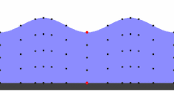 - Selon l'angle d'attaque du tsunami sur la côte et la géométrie de celle-ci, le tsunami peut interférer avec sa propre réflexion et provoquer une série de vagues stationnaires avec des zones côtières non inondées (« nœuds ») et des zones avoisinantes particulièrement touchées (« ventres »).