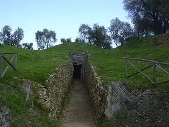 Le tumulus est constituée par une chambre circulaire avec un long dromos d'accès divisé en deux secteurs, un à ciel ouvert et un couvert, séparé par une porte à architrave. La couverture de la structure a été réalisée au moyen d'anneaux concentriques de blocs de pierre qui se réduisent graduellement vers le haut selon une technique définie de la « pseudo-coupole ». Le pilier central dit omphalos, n'avait pas pour but le soutien de la voûte (il n'atteint d'ailleurs pas à son sommet), mais symbole de l'axe du monde il liait le monde des vivants au monde des morts, virtuellement atteint dans le sol.
