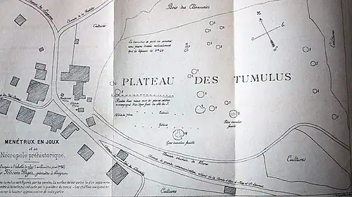 Ce groupe de tumulus se situait sur un petit plateau rocheux, aux lieux-dits « sur la Côte » et « bois des abreuvoirs ». Ce plateau constitue le sommet d'une petite colline dominant le village de Menétrux-en-Joux. Les fouilles, plans et croquis furent confiées à M. Félicien Paget, ancien employé des Ponts-et-Chaussées et géomètre à Songeson, déjà présent lors de la découverte de la station préhistorique de Ney en 1878. Sur la quarantaine de tumulus trouvés, probablement des vestiges d’une nécropole, beaucoup présentaient des pierres calcinées. Deux tumulus seulement ont été fouillés.