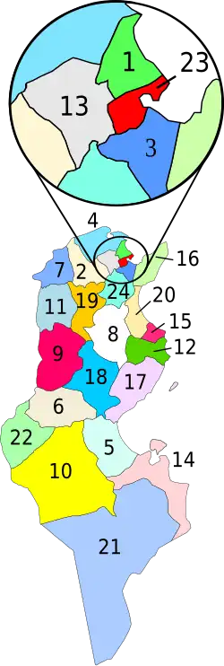 | 4 | Ettadhamen-Mnihla | Ariana | 142 953 | 14 | Monastir | Monastir | 93 306 |