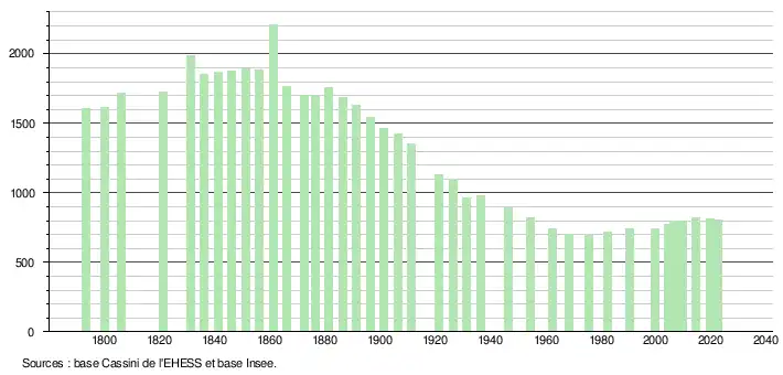 L'évolution du nombre d'habitants est connue à travers les recensements de la population effectués dans la commune depuis 1793. Pour les communes de moins de 10 000 habitants, une enquête de recensement portant sur toute la population est réalisée tous les cinq ans, les populations de référence des années intermédiaires étant quant à elles estimées par interpolation ou extrapolation[25]. Pour la commune, le premier recensement exhaustif entrant dans le cadre du nouveau dispositif a été réalisé en 2004[26].