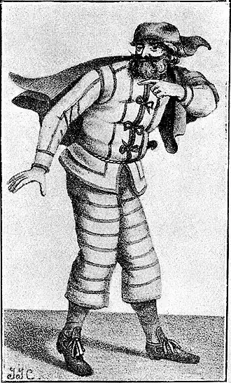 Son personnage de zanni est proche de celui de Brighella, portant chapeau à larges bords, mantelet, pantalon rayé et sabre de bois, son masque a moustache et barbe hirsutes[2]. On appelle péjorativement turlupinades les lazzis des acteurs jouant un peu dans le style de Turlupin : méchantes pointes, jeux de mots et équivoques faciles. Pourtant, Turlupin est considéré, en son temps, non seulement comme excellent farceur mais aussi bon comédien[3].