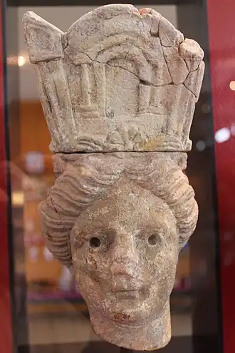 La tour placée sur la tête de la jeune femme, haute de 11 cm, est séparée de celle-ci. Elle était fixée par une colle ou un mortier[D 5]. Les motifs antérieurs de la tour sont continus avec la tête[D 5] alors que cette continuité n'est pas présente à l'arrière de la statue[B 2]. Cette différence est peut-être liée à « une maladresse d'exécution ou (…) une réfection (…) tardive »[D 5]. Une demi-fleur est présente sur l'avant. Une voûte[D 9], deux colonnes et une porte sont présentes également sur la face antérieure de la tour[B 2]. La représentation est similaire à un arc de triomphe ou une porte d'édifice ou de ville[B 6]. « L'existence de tours indique clairement que l'on se trouve en présence d'une porte de ville[D 9]. » L'arrière et les côtés de la tour sont dégradés par l'incendie qui a détruit l'édifice[B 2],[D 5].