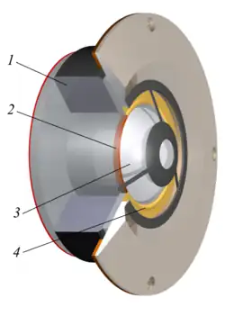 • à ogive : ce type de tweeter comporte une ogive centrale et une membrane annulaire. Très souvent il est associé à un pavillon, plus ou moins développé, pour améliorer son efficacité. Ce type de tweeter offre généralement une efficacité assez élevée.