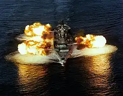 - ↑ Le New Jersey, retiré du service en 1969, est le premier cuirassé à reprendre du service conformément au programme du plan « Marine de 600 navires ».