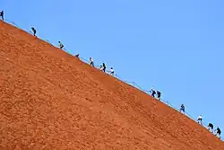 Jusqu'à son interdiction en , l'ascension d'Uluru/Ayers Rock est une attraction populaire. Elle suit alors un parcours de 1,6 kilomètre. La montée est longue (plus d'une heure de grimpe) et peu aisée car la pente varie de 30 à 60 degrés à certains endroits, les conditions climatiques peuvent être difficiles et la roche glissante. La main courante, une chaîne ajoutée en 1964 et rallongée en 1976, indispensable par endroits, permet une ascension plus aisée. Mais les accidents, parfois mortels (35 décès connus au total[12]), sont nombreux. Les vents peuvent être violents et la température atteindre 45 °C l'été[42]. Au sommet du rocher, extrêmement venteux, se trouve un repère géodésique et d'orientation qui permet d'identifier les montagnes environnantes jusqu’à 157 kilomètres de distance.