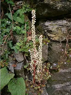 La plante a une longueur de (9)15-30(60) cm. Ses feuilles radicales, longuement pétiolées (4-25 cm) sont orbiculaires et peltées[4], possédant une dépression en forme de nombril au centre du limbe. Les feuilles de la tige, plus petites, sont linéaires lancéolées. Les fleurs hermaphrodites en forme de clochettes d'un blanc verdâtre ou jaune pâle, parfois rose, apparaissent de mai à août, sur des pédicelles le long de grappes terminales denses, l'inflorescence occupant (60)70-90 % de la tige[5]. La pollinisation est entomogame et autogame. Les fruits verts, des capsules à graines nombreuses, mûrissent au cours de l'été. La dissémination est dyszoochore[6].
