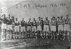 L'USMB a débuté en 3e division la saison 1933/34 avec obligation de faire signer trois français de souche et d'aligner à chaque match uniquement deux joueurs. Le premier match officiel a été disputé au stade Duruy (stade Daïdi actuel) le , l'USMB a perdu 3 à 1[10] devant le Sporting Club de Médéa. La première équipe alignée est la suivante : Dahmane (gardien), Sid-Ahmed Chelha, Mohamed Zouraghi, Ahmed Houari, Khelil Benrekaa, Dahmane Zatout, Mohamed Boumaza, Mohamed Hadef, Hacéne Kermouche, Mohamed Morina (gardien remplaçant) et Mohamed Berrahal.