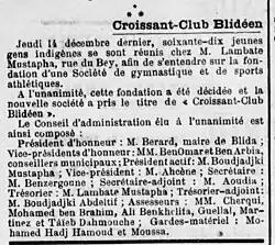 Les jeunes Arabes de la ville n'avaient pas le droit de pratiquer le sport. Chose qui leur était interdite par les autorités locales ; ils ne pouvaient donc pas prétendre adhérer à cette société, car considérés par ces derniers, comme des paysans endurcis, et par conséquent, inaptes à toute activité créative. Les années 1910, des jeunes Blidéens décident de créer un club musulman de Blida, après plusieurs démarches au début des années 1910 (Le Croissant Club Blidéen fondé en décembre 1911 sous la présidence de Boudjakdji Mustapha[1] puis Le Sporting Club Blidéen en janvier 1921 présidé par Hassen Benabdellah[2],[3]). Des contacts sont amorcés auprès de la ligue française de football et de la préfecture pour la délivrance d'agrément. Elle accueillait les sportifs arabes de la ville ainsi que ceux de la Mitidja, les initiant au militantisme pour leur permettre de participer à la lutte que menait le peuple algérien pour se libérer du joug colonial, créer un cadre authentique de patriotisme à la jeunesse musulmane et gagner contre une équipe française permettant l'affirmation de la personnalité algérienne.