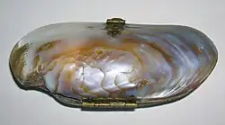 Reste d'un boitier sac-à-main d'époque victorienne, fait avec la nacre d'un unionidé).