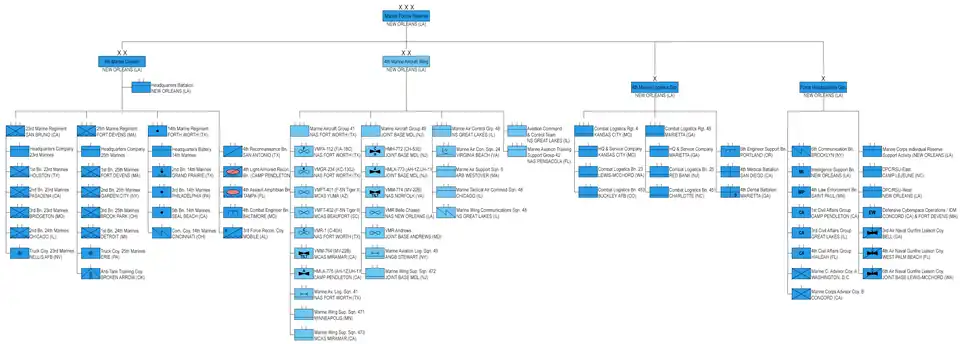 La MARFORRES est composée principalement de deux groupes de Marines et de marins. Les premiers, connus sous le nom de Réserve du Corps des Marines (SMCR), sont des Marines qui appartiennent généralement à des unités de réserve et ont une obligation minimale de servir un week-end par mois et deux semaines par an. Le deuxième groupe est connu sous le nom de réserve individuelle prête (IRR). L'IRR est composé de Marines qui ont terminé leur service actif ou leurs obligations USMCR, cependant, leurs noms restent enregistrés pour être appelés en cas de guerre ou autre urgence. La réserve IRR est administrée par la Marine Corps Individual Reserve Support Activity (MCIRSA). Les Marines IRR participent aux rassemblements annuels pour s'enregistrer auprès du Corps.