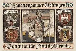 Monnaie de nécessité mise en circulation par la chambre de commerce de Göttingen au début des années 1920 à l'effigie d'un étudiant.