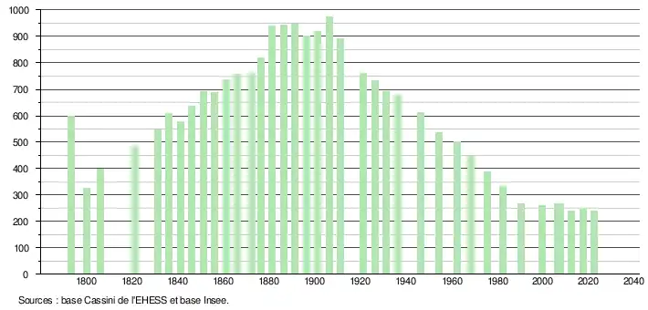 L'évolution du nombre d'habitants est connue à travers les recensements de la population effectués dans la commune depuis 1793. Pour les communes de moins de 10 000 habitants, une enquête de recensement portant sur toute la population est réalisée tous les cinq ans, les populations de référence des années intermédiaires étant quant à elles estimées par interpolation ou extrapolation[32]. Pour la commune, le premier recensement exhaustif entrant dans le cadre du nouveau dispositif a été réalisé en 2007[33].
