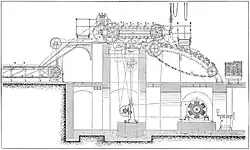 Juste en dessous des scies, dans le sous-sol du bâtiment, se trouvait l'arbre d'entraînement principal, qui portait six roues reliées par des courroies aux roues situées sur les arbres des scies. L'arbre d'entraînement était monté de manière à pouvoir être déplacé vers le haut et vers le bas afin de desserrer et de tendre les courroies. Ce réglage pouvait être effectué depuis le sol principal. La lame de scie était constituée d'une série de plaques de fonte relevables qui pouvaient être retournées pour vérifier et régler les scies. Les roulements étaient directement lubrifiés. La résine qui s'accumulait sur le bois de pin lors du sciage était éliminée par de fins jets de kérosène pompés dans un réservoir de 22,5 litres (5 gallons) à travers trois tuyaux principaux et 34 tuyaux secondaires, et occasionnellement pulvérisés sur les deux côtés de toutes les scies, sans interrompre le fonctionnement de la machine, en ouvrant les robinets des trois tuyaux principaux qui alimentaient les trois groupes de sciage.