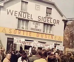 En effet, en avril 1967, une grève générale d'un mois avait été amorcée à Knutange. Celle-ci s'inscrivait dans une logique anticapitaliste et organisait un font uni et solidaire des mineurs des mines de fer. Elle avait débouché sur quelques avancées sociales[MF 5]. En 1971, la fermeture de l'usine de Knutange, évidente au vu des investissements consentis ailleurs, inquiète car le monde ouvrier devine — avec raison — que d'autres fermetures sont également programmées. Mais la grève de 1971 reste isolée et échoue. C'est le fruit des divisions syndicales de l’après mai 1968, et l'action se limitera à négocier les conditions de départ[MF 6]. De plus, la situation économique se dégrade brutalement après le (annonce de l'inconvertibilité du dollar en or)[37]. Il faut encore rationaliser mais pour l'usine, le « plan Dherse », qui est annoncé en , se borne à confirmer les décisions antérieures : l'aciérie et les gros trains sont fermés en [40].