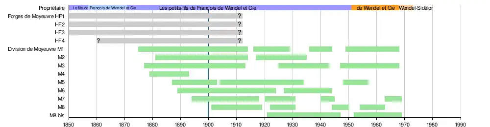 Les forges poursuivent leur expansion malgré la conjoncture. En 1843, elles comptent 2 hauts fourneaux, 6 feux d’affinerie et 10 fours à puddler. En 1849, 3 hauts fourneaux sont identifiables[15]. En 1854, on relève, en plus des 3 hauts fourneaux, 2 feux d’affinerie et 18 fours à puddler. Juste avant 1870, il y 4 grands hauts fourneaux[note 5] et 45 fours à puddler, ainsi que 13 laminoirs (3 à Moyeuvre-Grande et 10 à Jamailles et Moulin-neuf, qui ferme en 1885)[SF 1].