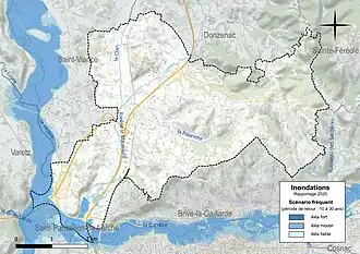 La commune fait partie du territoire à risques importants d'inondation (TRI) de Tulle-Brive, regroupant 20 communes concernées par un risque de débordement de la Corrèze et de la Vézère (17 dans la Corrèze et trois dans la Dordogne), un des 18 TRI qui ont été arrêtés le 11 janvier 2013 sur le bassin Adour-Garonne[16]. Des cartes des surfaces inondables ont été établies pour trois scénarios : fréquent (crue de temps de retour de 10 ans à 30 ans), moyen (temps de retour de 100 ans à 300 ans) et extrême (temps de retour de l'ordre de 1 000 ans, qui met en défaut tout système de protection)[17]. La commune a été reconnue en état de catastrophe naturelle au titre des dommages causés par les inondations et coulées de boue survenues en 1982, 1983, 1993, 1999, 2001, 2008 et 2016[18],[14]. Le risque inondation est pris en compte dans l'aménagement du territoire de la commune par le biais du plan de prévention des risques (PPR) inondation « Corrèze et affluents du bassin de Brive-la-Gaillarde », approuvé le [19].