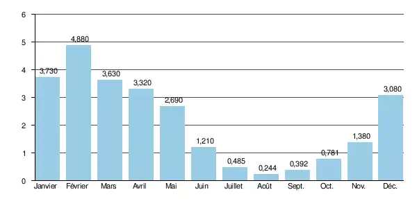 À l'étiage le VCN3 peut chuter jusque 0,008 m3/s, en cas de période quinquennale sèche, soit 8 petits litres par seconde, ce qui est extrêmement sévère, le cours d'eau se trouvant alors presque à sec.