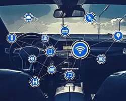 Une voiture connectée est une voiture disposant de systèmes de communication embarqués qui permettent des communications sans fil avec l'environnement, autres véhicules, infrastructures routières (feux tricolores, bornes) ou cloud.
