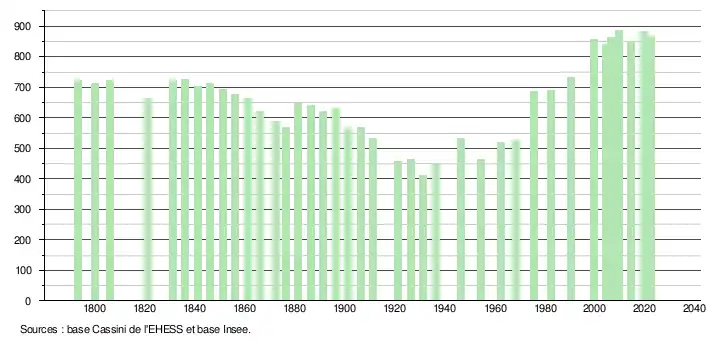 L'évolution du nombre d'habitants est connue à travers les recensements de la population effectués dans la commune depuis 1793. Pour les communes de moins de 10 000 habitants, une enquête de recensement portant sur toute la population est réalisée tous les cinq ans, les populations de référence des années intermédiaires étant quant à elles estimées par interpolation ou extrapolation[22]. Pour la commune, le premier recensement exhaustif entrant dans le cadre du nouveau dispositif a été réalisé en 2004[23].