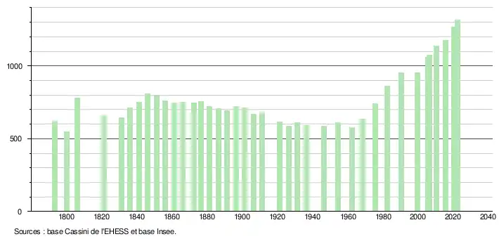 L'évolution du nombre d'habitants est connue à travers les recensements de la population effectués dans la commune depuis 1793. Pour les communes de moins de 10 000 habitants, une enquête de recensement portant sur toute la population est réalisée tous les cinq ans, les populations de référence des années intermédiaires étant quant à elles estimées par interpolation ou extrapolation[15]. Pour la commune, le premier recensement exhaustif entrant dans le cadre du nouveau dispositif a été réalisé en 2005[16].