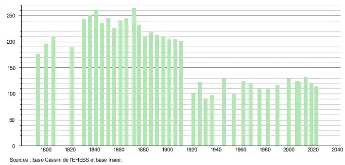 L'évolution du nombre d'habitants est connue à travers les recensements de la population effectués dans la commune depuis 1793. Pour les communes de moins de 10 000 habitants, une enquête de recensement portant sur toute la population est réalisée tous les cinq ans, les populations de référence des années intermédiaires étant quant à elles estimées par interpolation ou extrapolation[23]. Pour la commune, le premier recensement exhaustif entrant dans le cadre du nouveau dispositif a été réalisé en 2008[24].