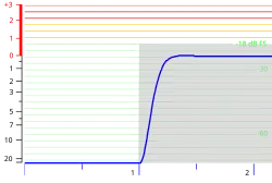 La zone grisée est le niveau en Décibel pleine échelle (dB FS) d'un signal normalisé à −1,5 dB FS, intégré sur 6,5 ms (réponse d'un PPM); le trait bleu indique la position de l'aiguille par rapport à la graduation du VU-mètre, à gauche. Le temps est en secondes.