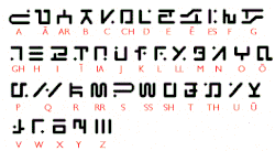 - L'alphabet utilisé par les visiteurs, composé de quarante-et-une lettres est en fait une simple substitution des vingt-six lettres de l'alphabet latin auxquelles s'ajoutent quinze symboles représentant diverses associations de deux lettres courantes en langue anglaise.
