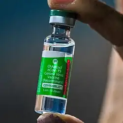 Le vaccin d'AstraZeneca-Oxford contre la Covid-19, officiellement nommé COVID-19 Vaccine AstraZeneca[4] est un vaccin contre la Covid-19 mis au point par l'université d'Oxford et la société pharmaceutique AstraZeneca à partir de l'adénovirus ChAdOx1 (en) d'un chimpanzé[7],[8],[9],[10]. Lors de son développement, il a précédemment été nommé ChAdOx1 nCoV-19[4],[11], puis AZD1222[11]. Il est plus généralement connu par le nom de vaccin Oxford-AstraZeneca, ses noms commerciaux sont Covishield ou Vaxzevria. Il doit être injecté dans les muscles. Pour atteindre son efficacité maximale, deux doses doivent être injectées dans un intervalle maximal de 12 semaines[12].