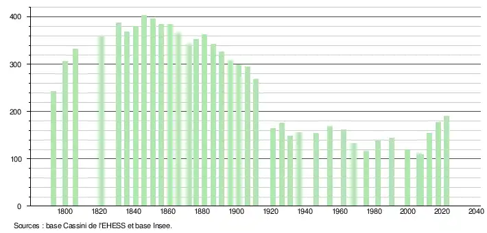 L'évolution du nombre d'habitants est connue à travers les recensements de la population effectués dans la commune depuis 1793. Pour les communes de moins de 10 000 habitants, une enquête de recensement portant sur toute la population est réalisée tous les cinq ans, les populations de référence des années intermédiaires étant quant à elles estimées par interpolation ou extrapolation[19]. Pour la commune, le premier recensement exhaustif entrant dans le cadre du nouveau dispositif a été réalisé en 2007[20].