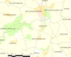 Valescourt est un village établi sur la rive droite de l'Arré. Il s'étire principalement sur deux rues parallèles, la rue de Clermont et la rue de la mairie[2]. La rue de Beauvais est perpendiculaire à la rue de la mairie et à la rue de Clermont.