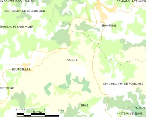 En 2018, année précédant son intégration à la commune nouvelle de Brantôme en Périgord, Valeuil était limitrophe de quatre autres communes.