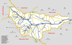 La vallée possède de nombreuses vallons latéraux, la plupart inhabités. Ceux du côté sud sont les plus importants en taille ; voici les principaux, de l'amont vers l'aval :