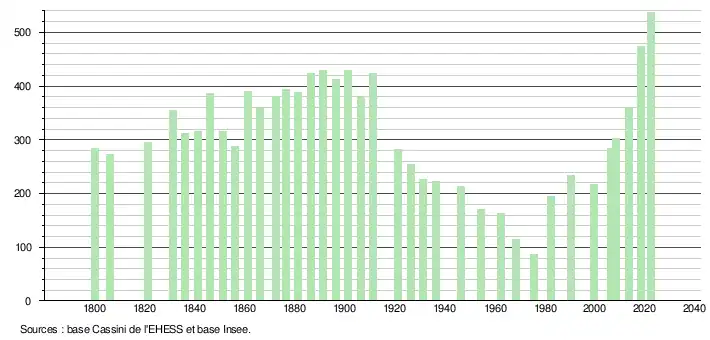 L'évolution du nombre d'habitants est connue à travers les recensements de la population effectués dans la commune depuis 1800. Pour les communes de moins de 10 000 habitants, une enquête de recensement portant sur toute la population est réalisée tous les cinq ans, les populations de référence des années intermédiaires étant quant à elles estimées par interpolation ou extrapolation[7]. Pour la commune, le premier recensement exhaustif entrant dans le cadre du nouveau dispositif a été réalisé en 2008[8].