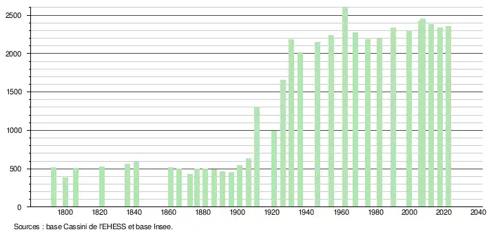 L'évolution du nombre d'habitants est connue à travers les recensements de la population effectués dans la commune depuis 1793. Pour les communes de moins de 10 000 habitants, une enquête de recensement portant sur toute la population est réalisée tous les cinq ans, les populations de référence des années intermédiaires étant quant à elles estimées par interpolation ou extrapolation[22]. Pour la commune, le premier recensement exhaustif entrant dans le cadre du nouveau dispositif a été réalisé en 2007[23].