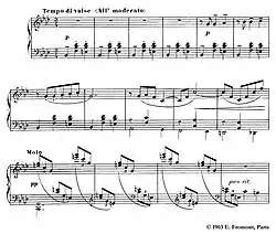 L’œuvre est dans la tonalité principale de fa mineur, tempo di valzer moderato, et « témoigne de l'amour du jeune compositeur pour Chopin et Borodine[2] ». Dans la première partie, des « volutes aériennes [...] ponctuent les phrases mélodiques et introduisent une dissymétrie dans les carrures[4] ». La partie centrale utilise le mode lydien (sol
