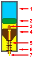 Elle se compose de nombreux éléments : tout d'abord le pointeau 3, qui évacue l'huile en provenance de l’amortisseur (lorsque celui-ci se comprime, si 7 est ouvert) vers la chambre principale 6 en jaune. Les ouvertures latérales du pointeau sont initialement obturées par la masselotte 4, maintenue en son point haut par le ressort. La partie supérieure du montage est composée du piston mobile,2, qui délimite la séparation entre la chambre principale (huile, fluide incompressible) et la chambre supérieure (remplie d'azote sous pression, qui est un fluide compressible).